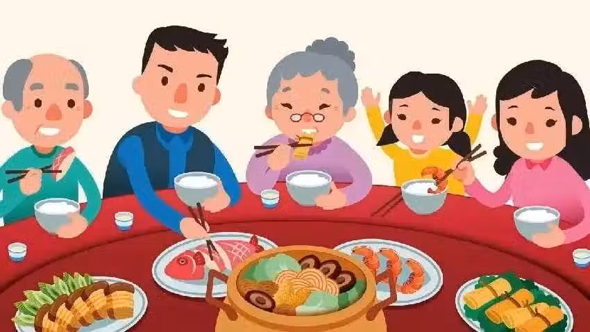 年夜飯象徵團圓,桌下放火爐,旁擺8枚錢幣寓意財運興旺。