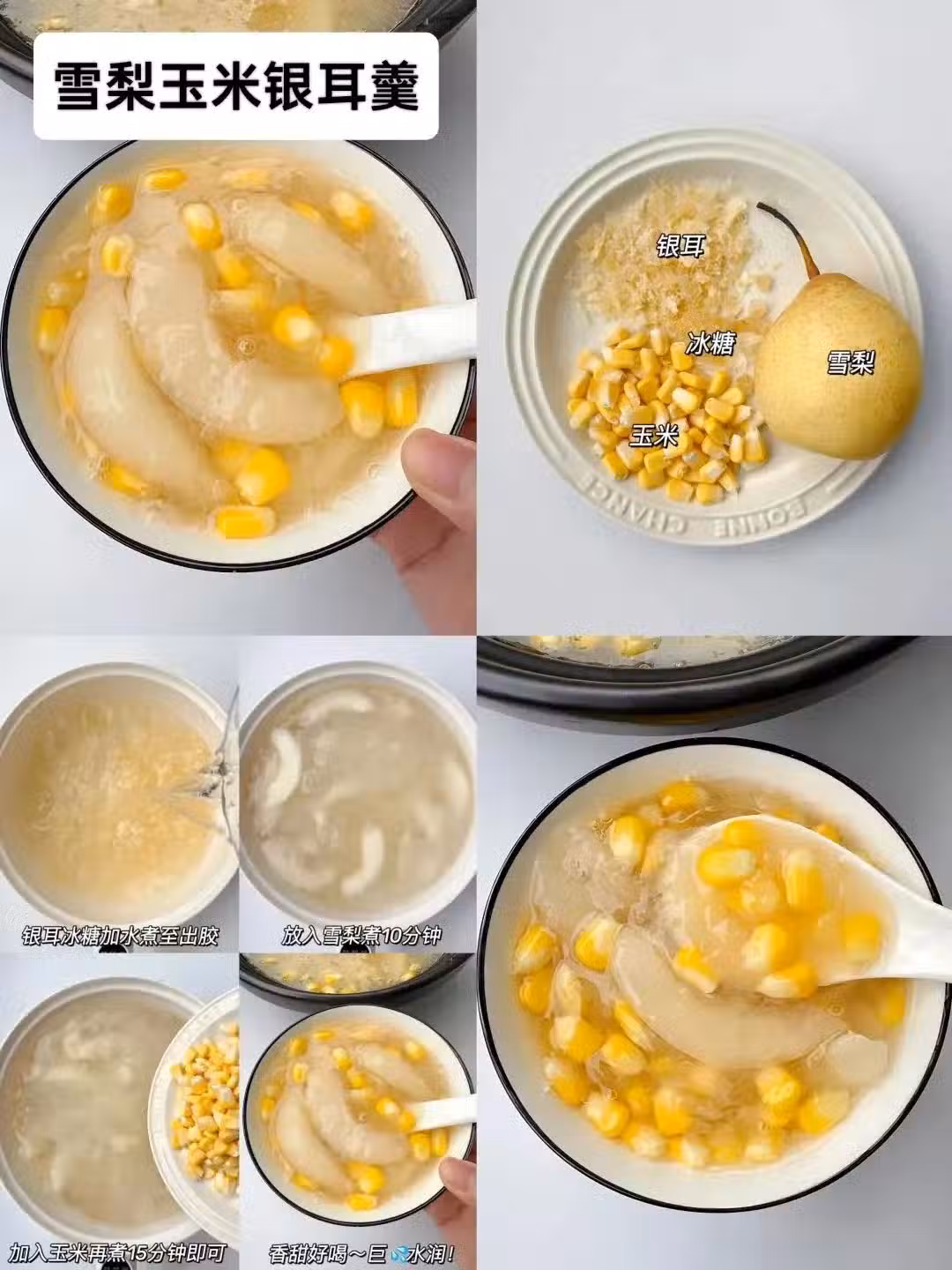 銀耳撕碎,和冰糖一起煮至出膠,放入雪梨煮10分鐘,加入玉米粒再煮15分鐘,這時候已經十分濃稠了,香甜好喝。