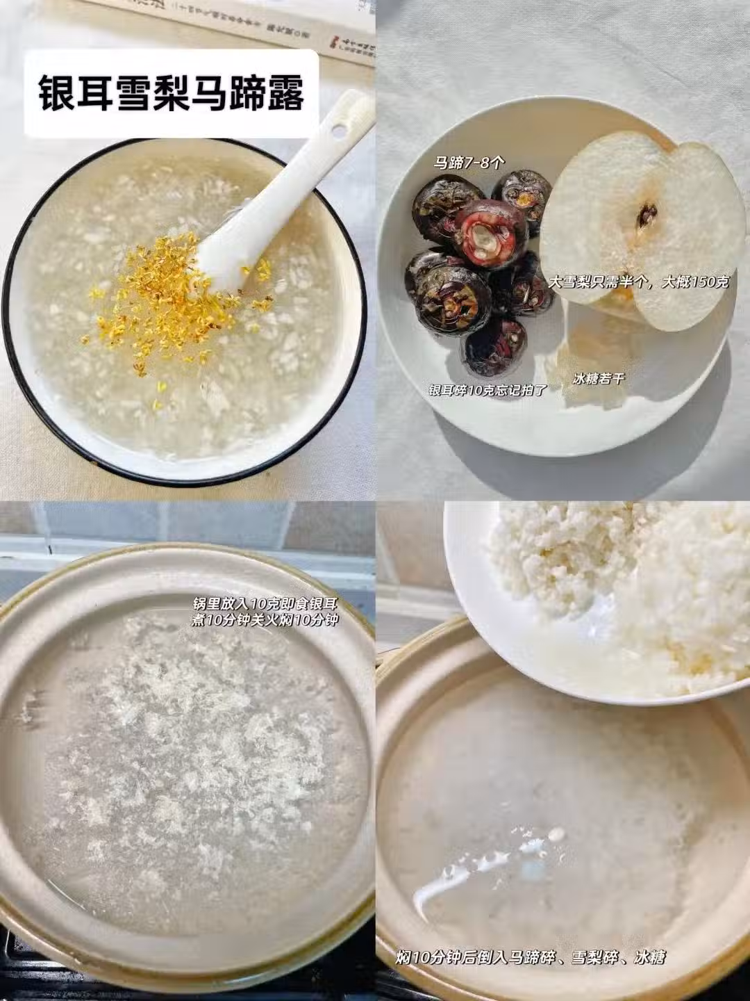 鍋中加水,放入即食銀耳,煮10分鐘,關火燜10分鐘,再放入雪梨、馬蹄和冰糖,邊倒邊攪拌,煮幾分鐘煮透即可食用。