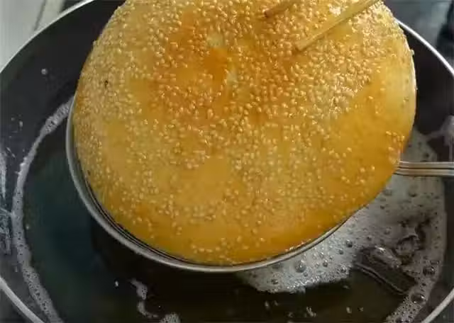 10.鍋里倒點油,油溫燒到六成熱的時候,放入大餅,全程用中小火來炸,底部炸成金黃色就翻個面,翻面的時候小心點哦,別讓熱油濺到身上,兩面都炸成金黃色,就可以出鍋啦!