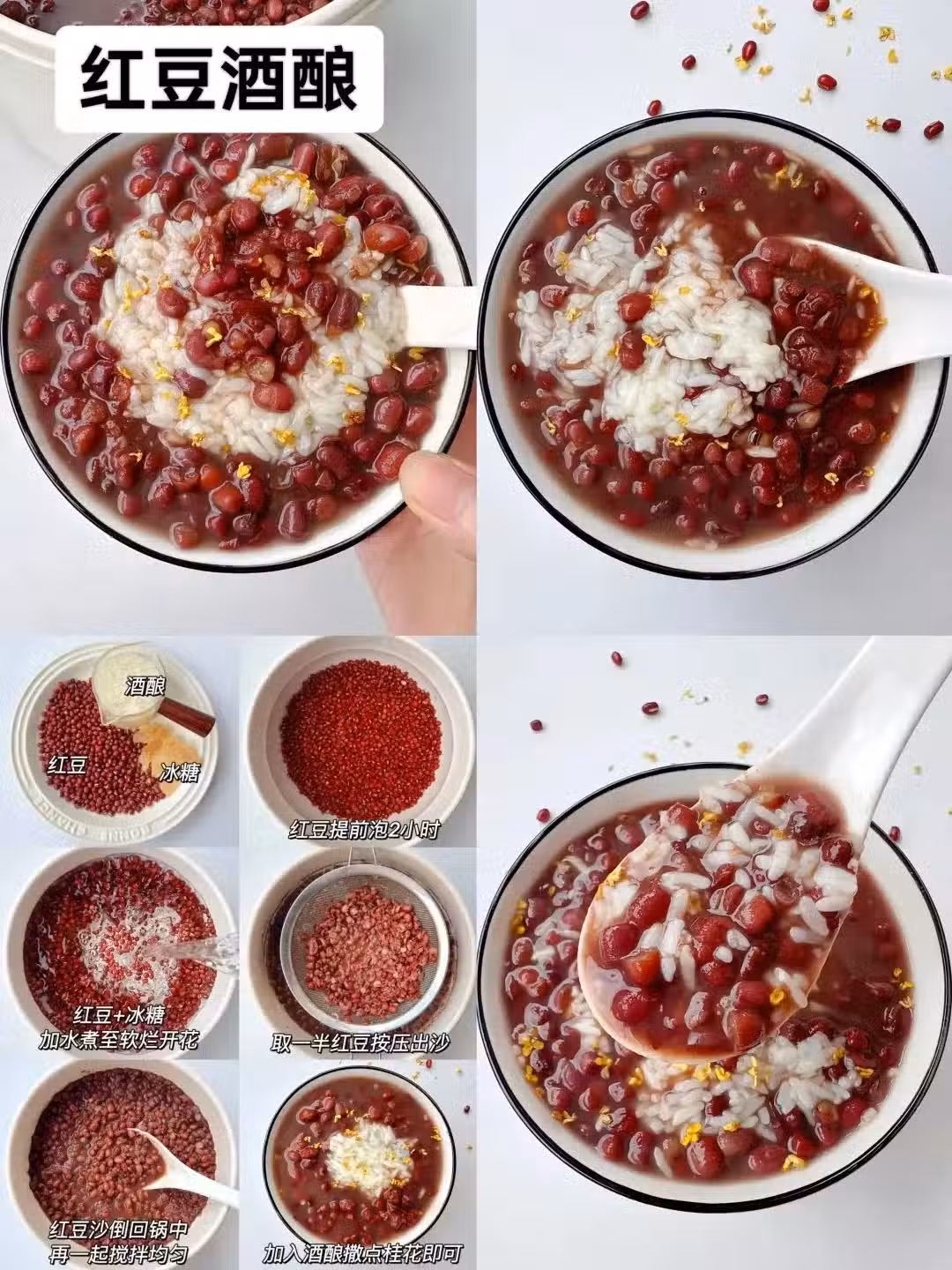 紅豆提前浸泡2小時,加冰糖一起煮到軟爛開花後,取一半的紅豆按壓成豆沙再倒回鍋中,倒入酒釀,撒點桂花裝飾就可以了。