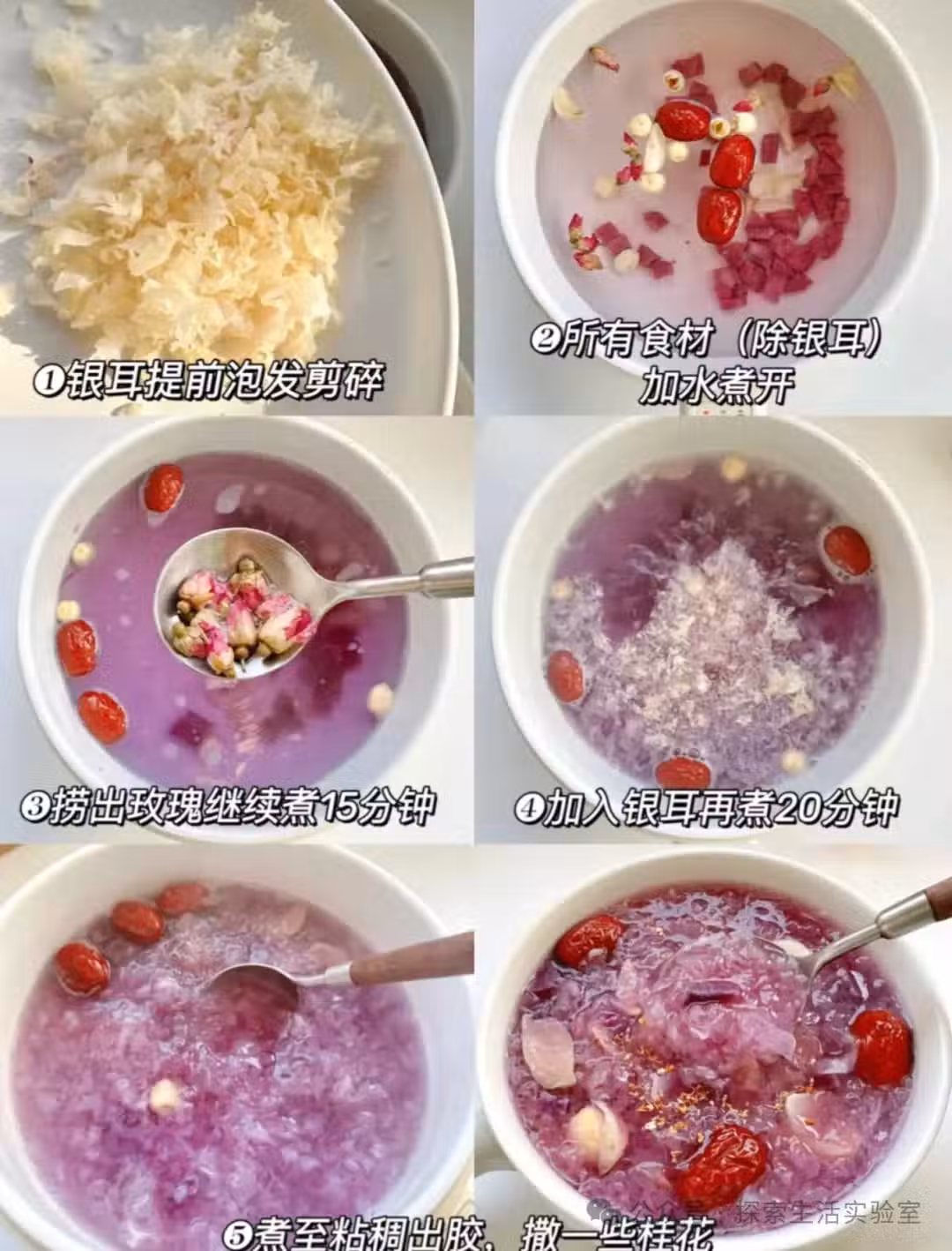 紫薯富含花青素和膳食纖維,銀耳滋陰潤肺、美容養顏 百合、蓮子養心安神,紅棗補血益氣 玫瑰花可疏肝解郁 這道紫薯銀耳羹口感清甜,營養豐富,具有 「滋陰補血,養顏安神」 的功效。 📒飲用小貼士: ① 紫薯如果食用過多可能會導致腹脹、消化不良,如果是腸胃功能較弱的,要適量吃哦。 ②銀耳如果儲存不當容易受黃麴黴污染,因此在購買的時候要挑選品質好、無異味的,泡發後發現有異常的,要丟掉不能用了。 02、紅豆酒釀桂花湯