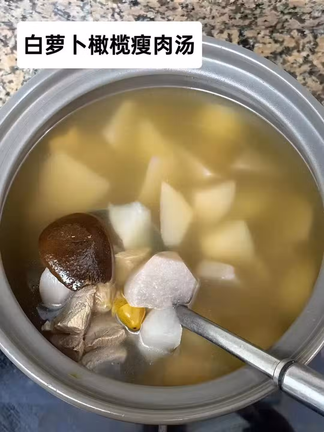 瘦肉切塊焯水備用;白蘿蔔帶皮切塊,青橄欖切開;所有食材放入砂鍋中,加水沒過食材,大火煮開後轉小火煮40-50分鐘,最後加點鹽調味。