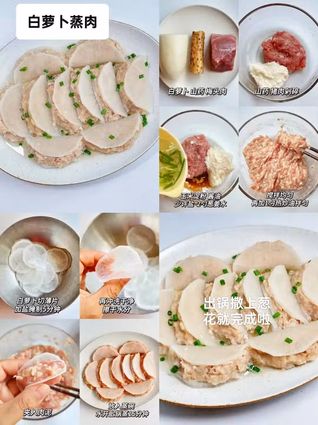 白蘿蔔切片加鹽腌制5分鐘(去掉辛辣味),沖洗乾淨擦乾水分後包入肉餡,擺盤放入盤中,水開以後上鍋蒸15分鐘左右,撒上蔥花大功告成!