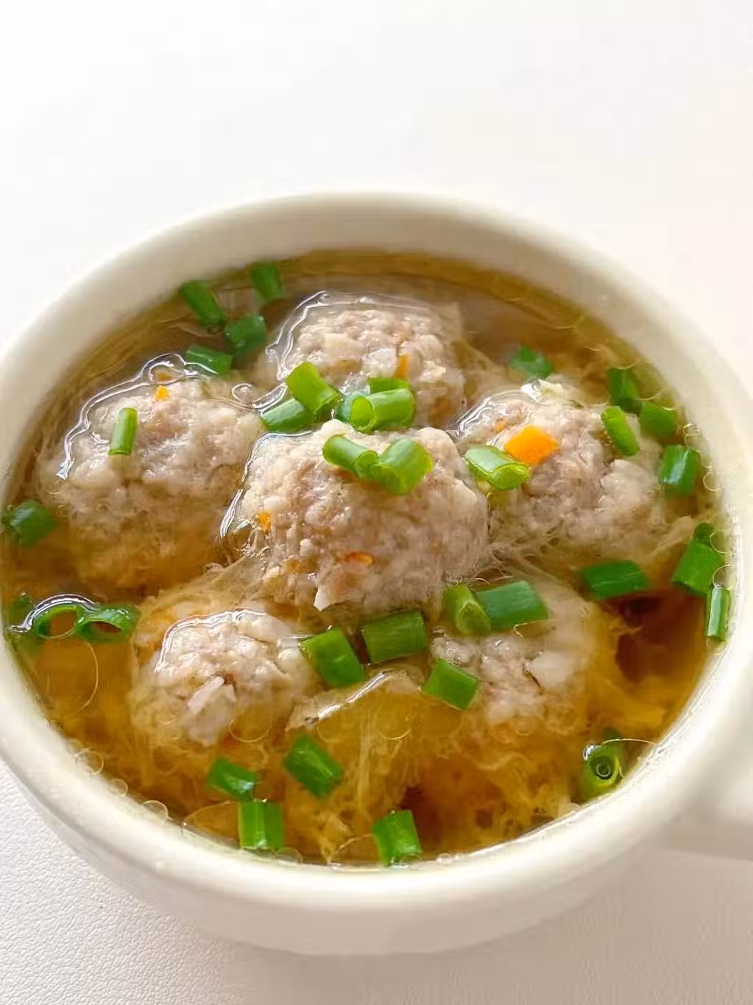 食材:肉沫300g、蓮藕1節200g、胡蘿蔔半根、蔥姜水、澱粉、醬油 做法: 1、將豬肉剁成肉沫,加入蔥姜水攪拌均勻,去腥增香。 2、蓮藕和胡蘿蔔去皮洗凈,擦成細泥,擠去多餘水分後加入肉沫中攪拌均勻。 3、放入少量澱粉和適量鹽、醬油(或者直接加入現成的澱粉菌菇粉和牛油果油調味),攪拌均勻後腌制5分鐘,將肉沫團成小肉丸。 4、在蒸碗中加入薑片、醬油和溫水調成的湯汁,將肉丸放入碗中,冷水上鍋蒸25分鐘,蒸熟後取出,撒上蔥花點綴即可。