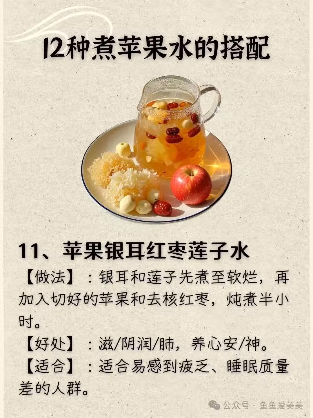 十二、蘋果紅酒水 做法:蘋果切塊,倒入紅酒沒過蘋果,蓋上蓋子中火燉煮15分鐘,關過,紅酒中浸泡半小時,放溫再喝。 好處:溫陽暖胃,活血化瘀。 適合:陽虛怕冷、氣虛無力者,尤其適合寒冷的秋冬季節。