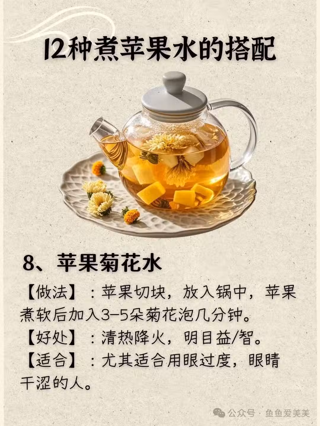 九、蘋果銀耳雪梨水 做法:銀耳先煮至出膠,再加入切好的雪梨、蘋果和去核紅棗,燉煮半小時左右。 好處:滋陰潤肺,清熱生津。 適合:寒露過後,天氣轉涼,潤肺止咳,適合喉嚨不適、乾咳少痰的人群。
