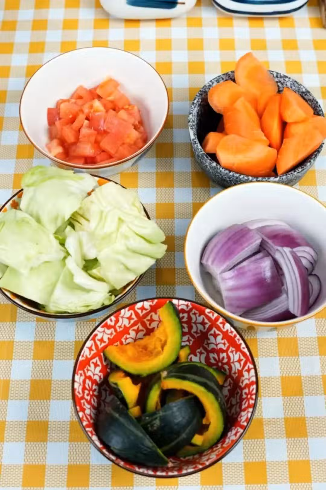 ·食材預處理:貝貝南瓜、胡蘿蔔洗凈切塊,不用去皮;洋蔥切塊;捲心菜手撕成大小均勻塊狀;西紅柿切丁。