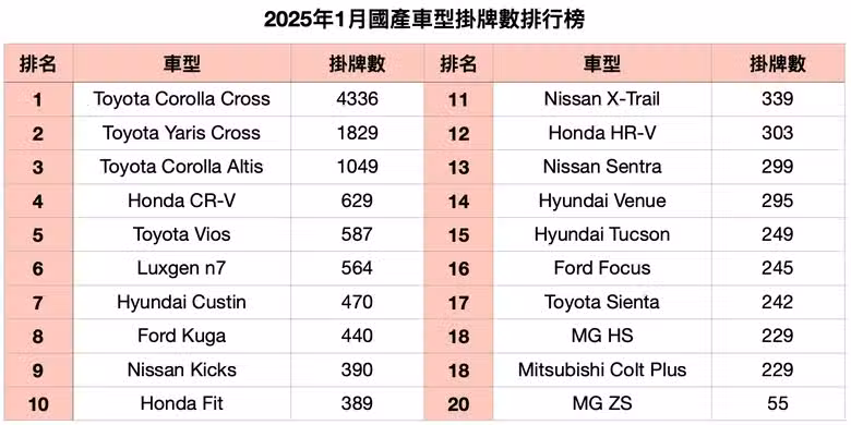 根據統計可以看到,2025年1月台灣整體市場掛牌數為35064輛,較上月衰退15.1%,也較去年同期衰退21.8%,但我們可以看到包括Corolla Cross與Yaris Cross都繳出亮眼的掛牌成績,而國產車陣營中的排名跟前幾個月相比,也出現了洗牌狀況,預計在下個月的數據中,可能還會出現再一次的洗牌狀況,詳情等下月再來仔細分析。