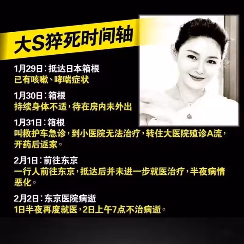 根據《三立娛樂星聞》與《ETtoday星光雲》報導,台灣知名藝人徐熙媛(大S)於日本旅遊期間不幸因流感並發肺炎驟逝,享年48歲,震驚演藝圈。