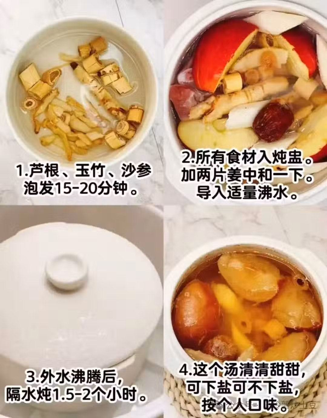 1.蘆根、玉竹、沙參泡發15-20分鐘。