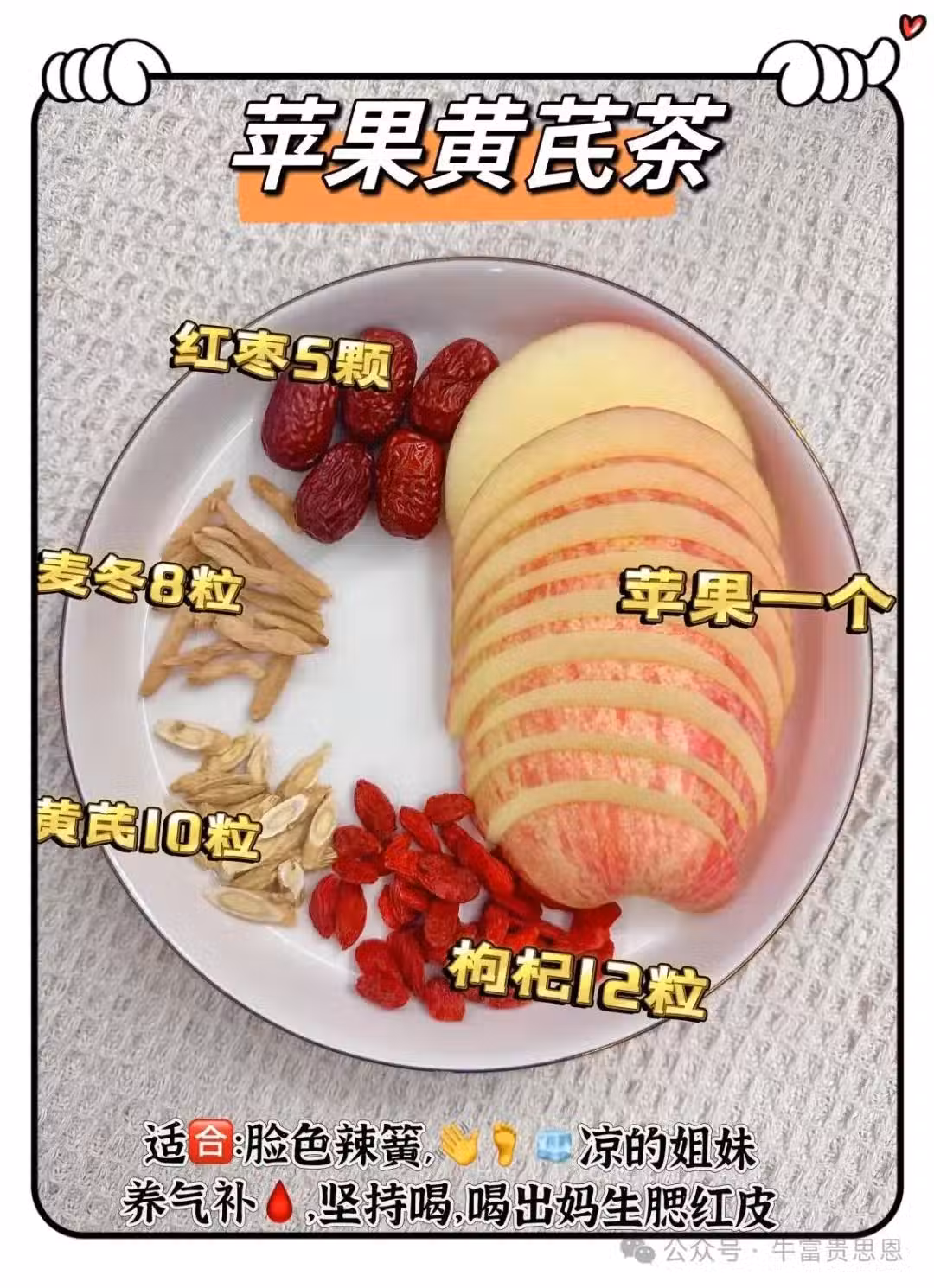 黃芪是常見中藥材,有補氣固表等功效;蘋果香甜富含維生素;紅棗可補氣養血;麥冬能養陰潤肺;枸杞滋補肝腎。