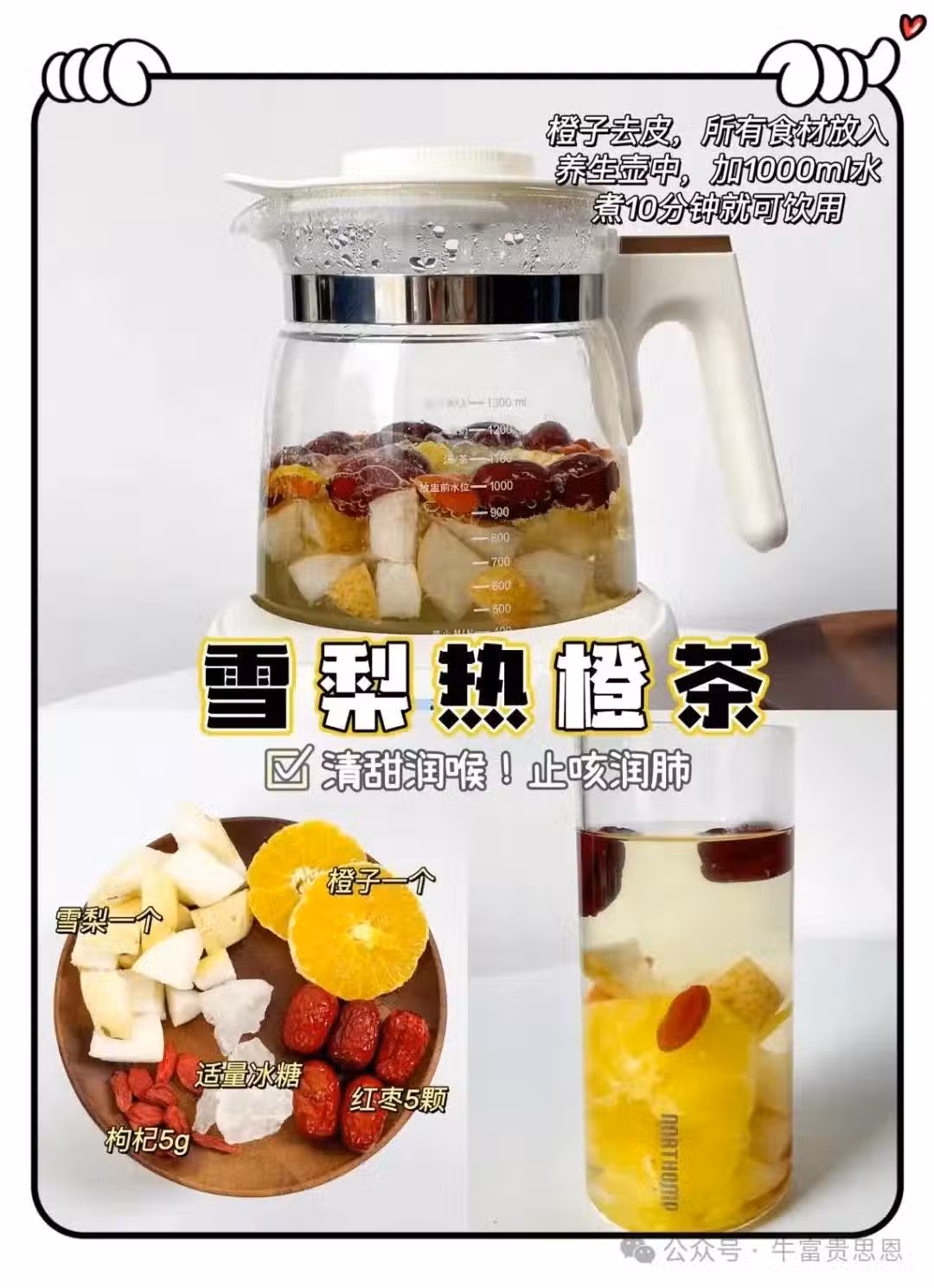 雪梨肉質細嫩,汁多味甜,有清熱潤肺、生津潤燥之效;橙子富含維生素C,能增強免疫力、開胃消食;枸杞可滋補肝腎、益精明目;紅棗則能補中益氣、養血安神;冰糖可增加甜味,使口感更加醇厚。