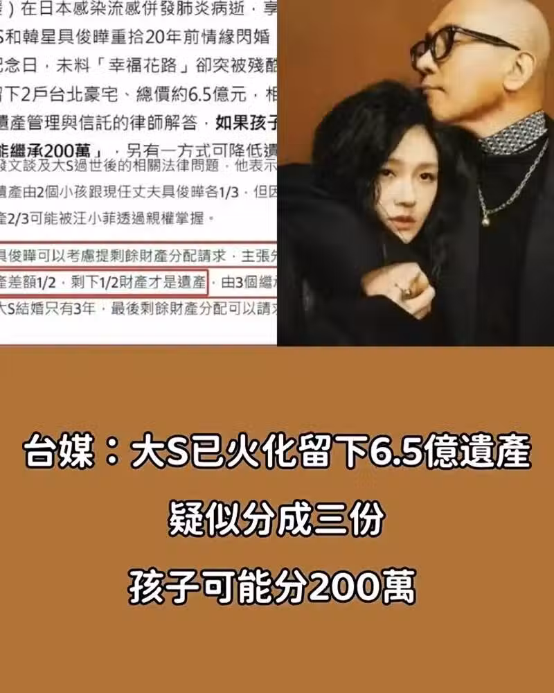 具俊燁成大贏家!大S已火化留下6.5億遺產,疑似分成三份,孩子可能分200萬