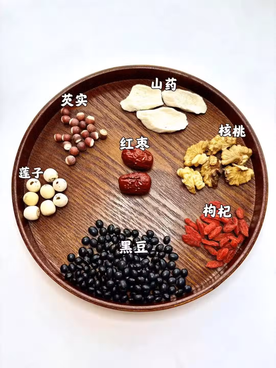 第二款 食材:黑豆、山藥、芡實、蓮子、核桃和枸杞 做法:所有食材洗乾淨,放鍋里大火燒開,小火煮60分鐘即可。