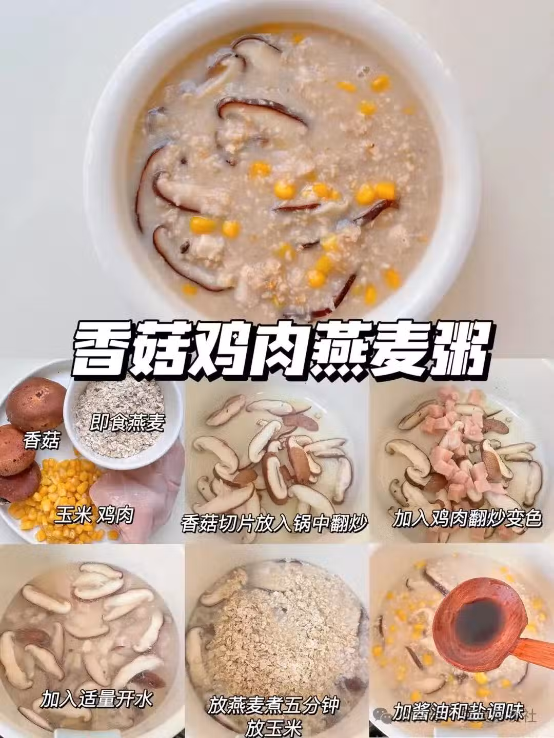 食材:燕麥片40g | 雞胸肉80g | 香菇3朵 | 玉米粒50g | 鹽、醬油適量