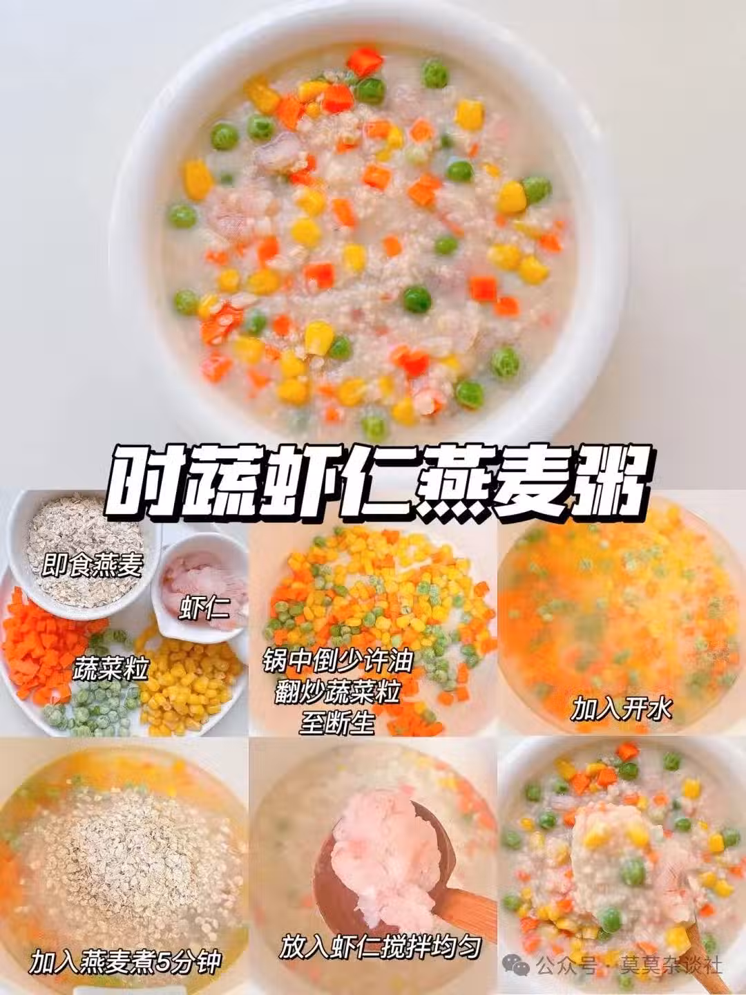 食材:燕麥片40g | 蝦仁80g | 胡蘿蔔50g | 青豆30g | 玉米粒50g