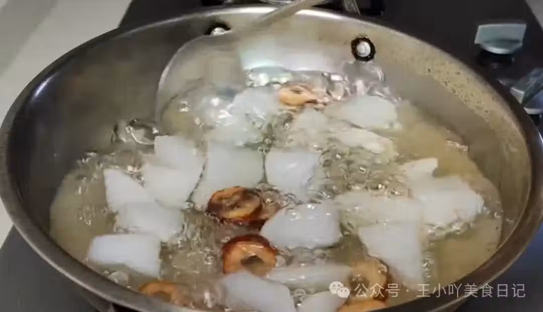 5、加入冰糖:20分鐘後,打開鍋蓋,加入適量冰糖。冰糖不僅能增加湯液的甜度,使其口感更佳,還能在一定程度上調和白蘿蔔的涼性,使其更適合脾胃較弱的人群飲用。 6、最後調味:加入冰糖後,繼續用小火煮制約5分鐘,期間需不時攪拌,確保冰糖完全融化,同時讓湯液的味道更加均勻。待冰糖完全溶解,湯液呈現淡琥珀色,即可關火。
