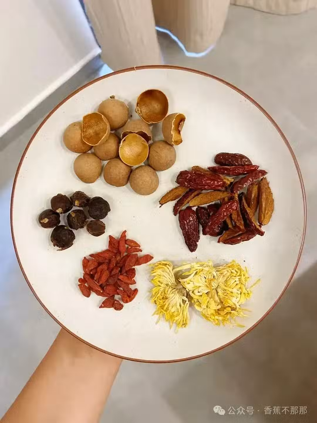 帶殼干桂圓6粒、紅棗4顆、枸杞子5g、菊花2朵。