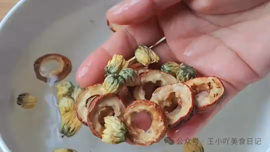2.準備菊花與山楂:與此同時,將干菊花和山楂干放入另一個盆中,撒入一小撮食鹽,倒入清水浸泡並輕輕搓洗。食鹽有助於去除表面的雜質和農藥殘留。山楂的酸甜口感能為這道飲品增添不少風味,同時也能促進消化,增強食慾。洗凈後,同樣控干水分備用。