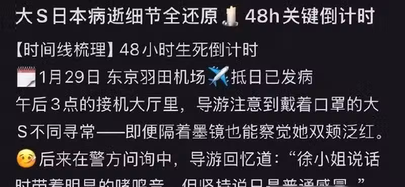 旅行過程中,大S的身體狀況早已開始亮起紅燈。知情人透露,在出發前,大S就出現了輕微的感冒症狀。但家人們並未引起足夠重視,甚至認為她只是「旅途疲勞」。到了日本後,天氣驟冷和連續奔波讓她的感冒逐漸加重,哮喘症狀也開始復發。然而,這樣的明顯信號,卻並未讓家人調整行程。