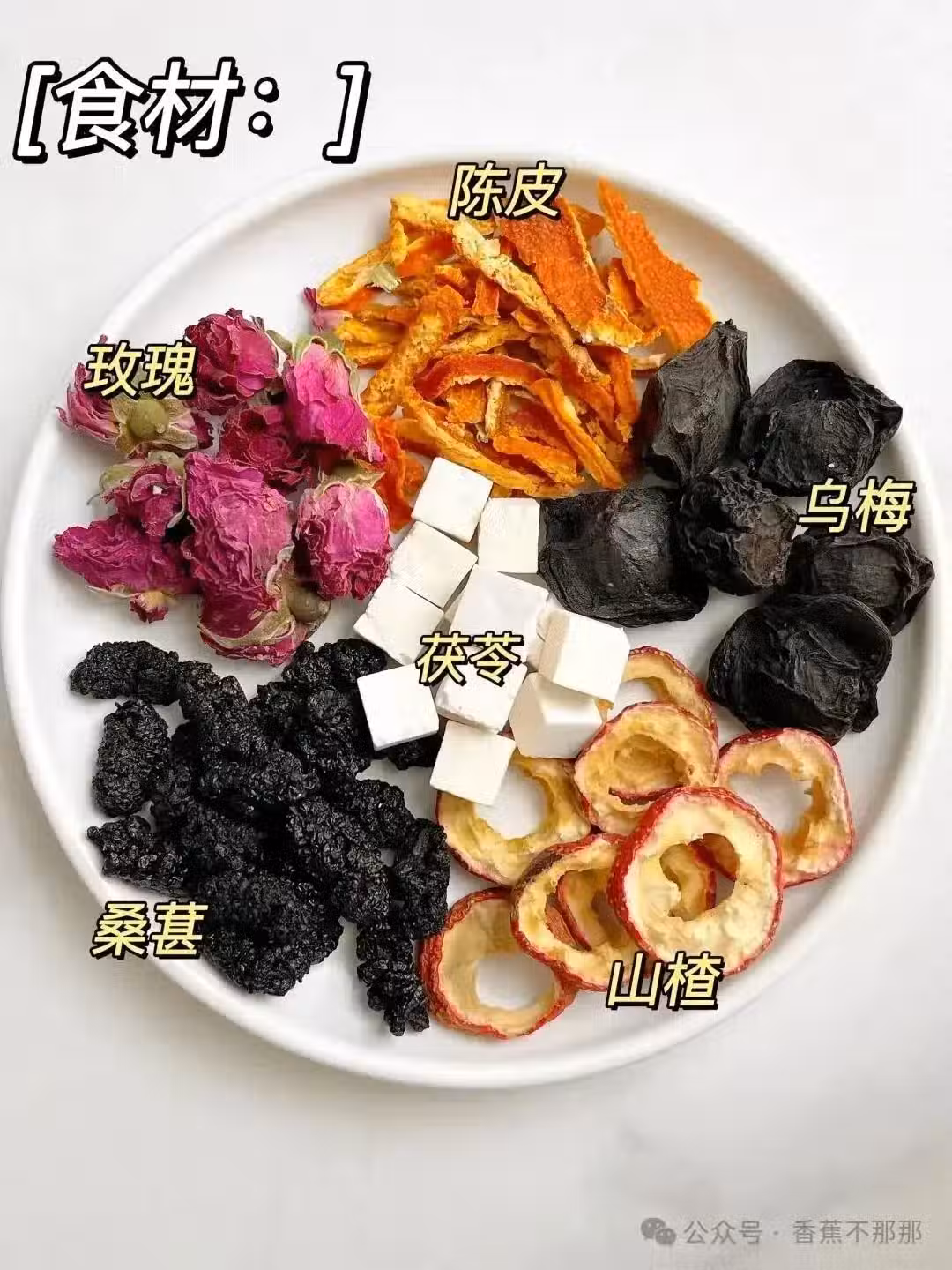 桑葚,玫瑰,茯苓,陳皮,山楂,烏梅。