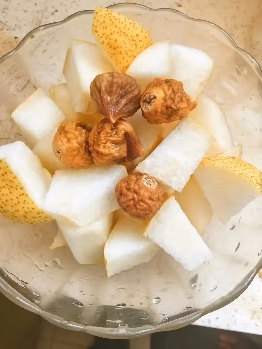 🍳做法:無花果,梨洗乾淨,倒入適量水,放入鍋中熬。30-60分鐘,把湯汁精華都熬出來,喝水。