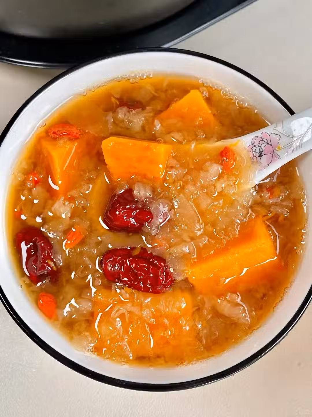 銀耳順滑滋潤,搭配甜甜的南瓜口感,真的非常美味!姨媽期喝這個真的很好!比紅糖水好喝多了,還能讓小臉紅撲撲的!