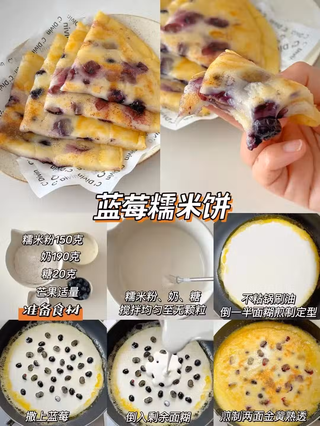 藍莓懟進糯米糰,直接上鍋煎!高溫下藍莓化身「深水炸彈」,一口爆漿,酸得眯眼,甜得跺腳!冷吃更絕,像在嚼糯米版藍莓冰淇淋。