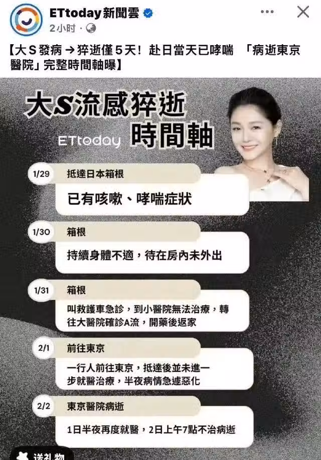 甚至在大S生命的最後幾十小時里,她的丈夫、母親和妹妹都不在她身邊。