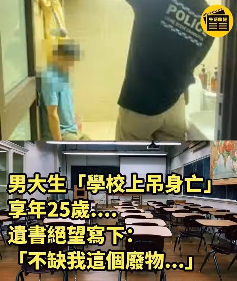 男大生「學校上吊身亡」享年25歲....遺書絕望寫下:「不缺我這個廢物...」
