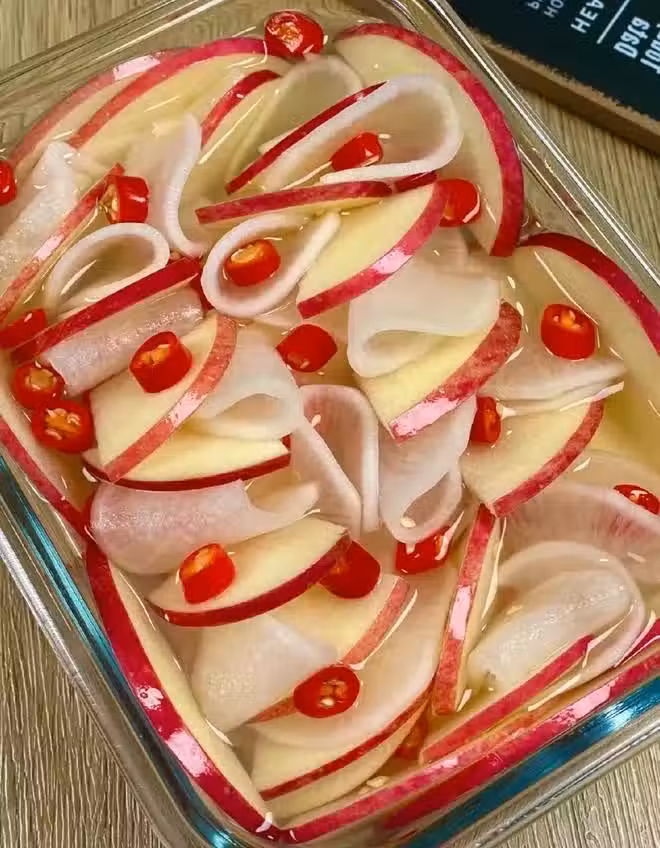 我之前只知道醋泡白蘿蔔、黃瓜、花生、蒜,還有辣椒,但醋泡蘋果還是頭一回見!光是這個名字就讓人忍不住想要嘗試一下。不管好不好吃,光是這獨特的組合就已經足夠吸引人了,你們有沒有同感呢?