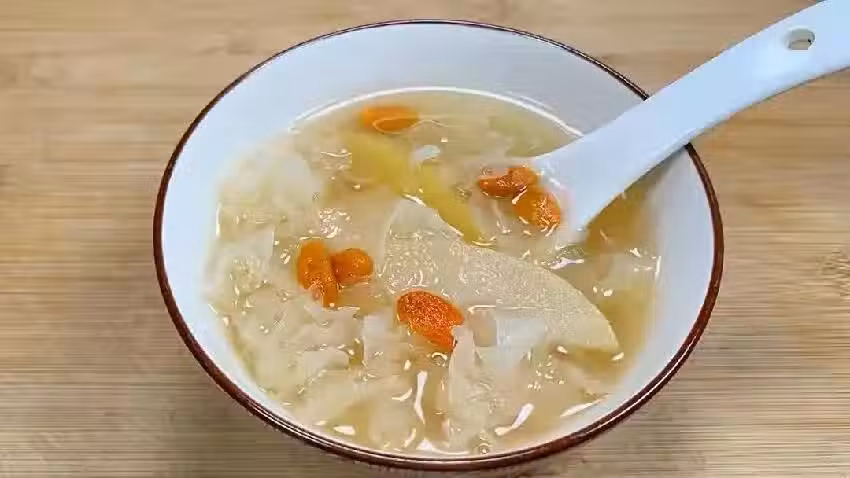 2、取一個煮鍋先把銀耳放入,倒入適量的清水,中小火把銀耳煮20分鐘,然後再放入提前切好的蘋果塊和雪梨塊,中小火繼續煮20分鐘,把雪梨和蘋果煮熟,出鍋前撒入枸杞再煮2分鐘關火就可以。