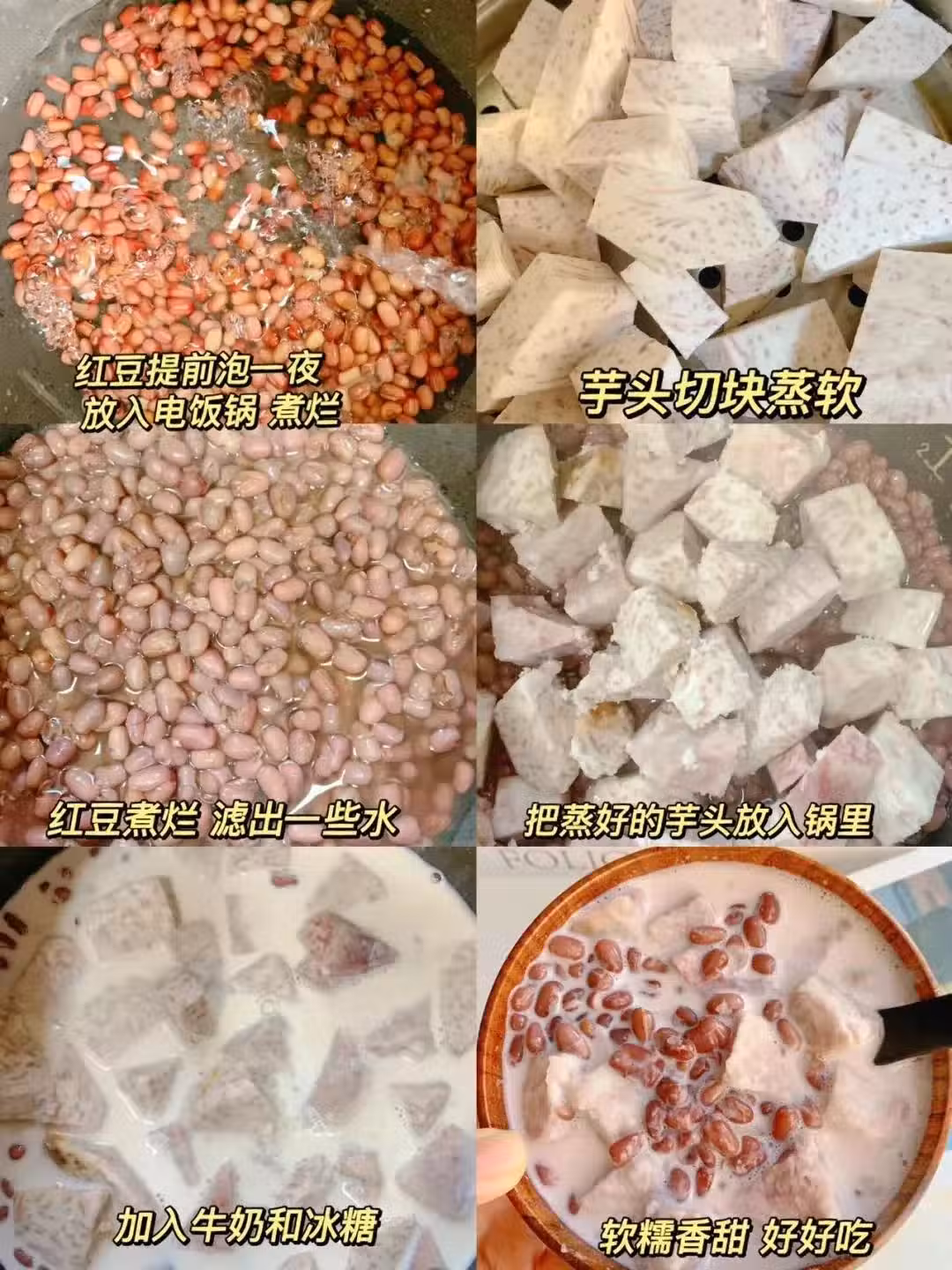 3.將蒸好的芋頭放入電飯鍋 ,再倒入牛奶和冰糖煮5分鐘 ,奶香軟糯的芋頭紅豆就出鍋了