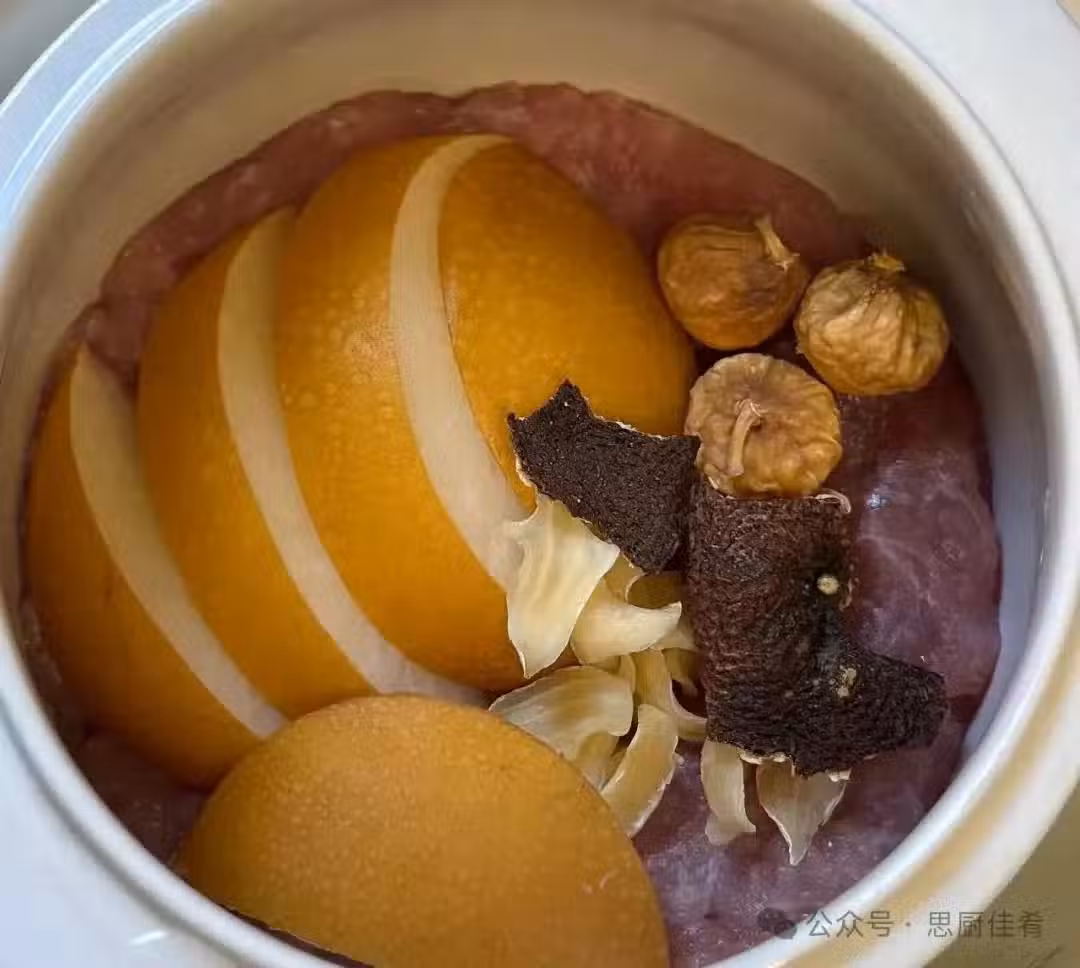 陳皮1瓣、百合8克、梨半個、無花果3顆、梅柳肉100克。瘦肉洗凈剁碎壓緊緊,鋪入燉盅再壓緊實,放入其他食材,浸泡30分鐘(析出營養物質),再隔水燉1.5小時,出鍋加微微鹽調味即可,不加鹽是清甜的,我家孩子3歲不加鹽也能炫這一盅~
