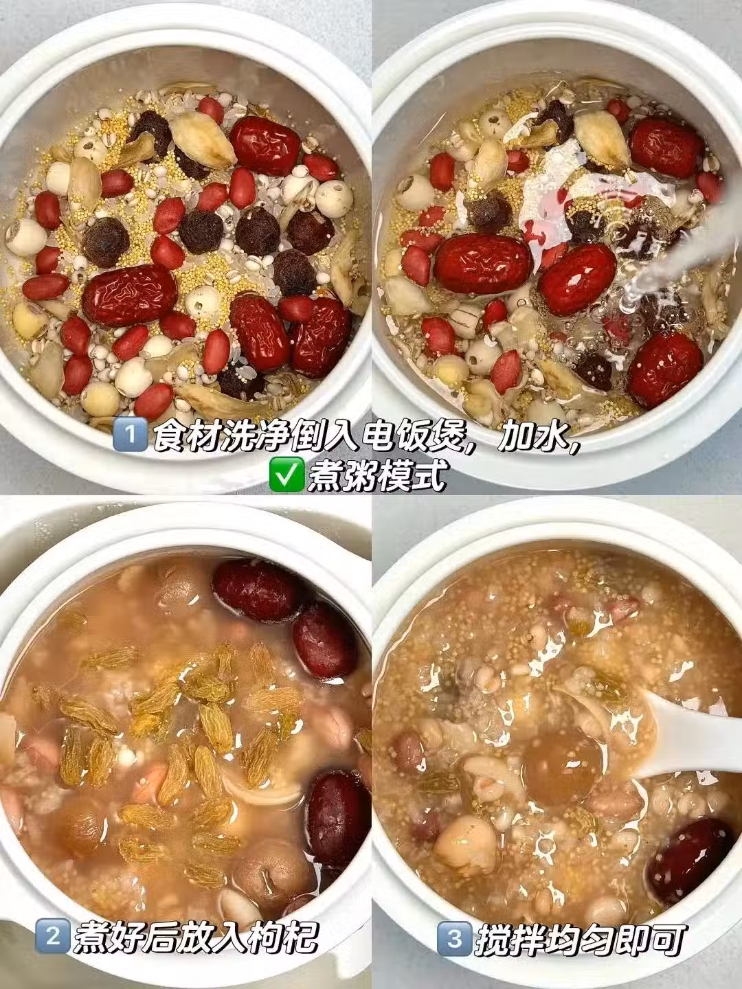 1. 準備食材:大米、小米、花生各21克,桂圓、枸杞、百合各10克。也可根據個人需求酌情添加蓮子、薏米等食材。