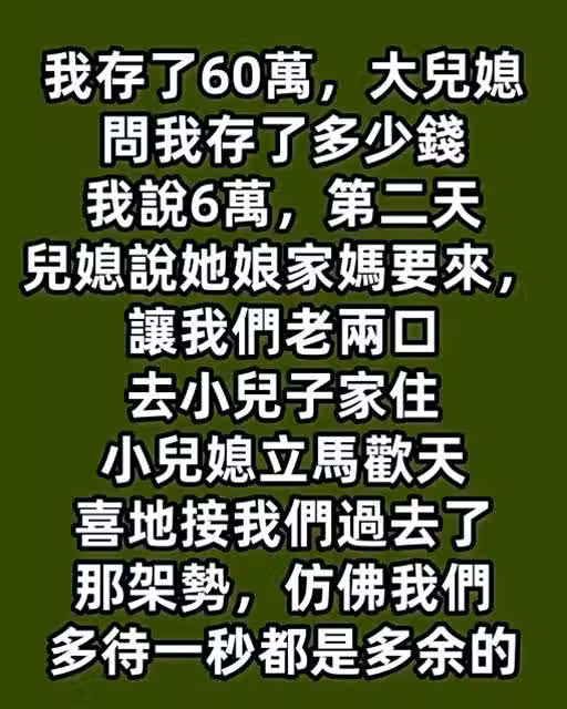我存了60萬,大兒媳問我存了多少錢,我說6萬,第二天兒媳說她娘家媽要來,讓我們老兩口去小兒子家住,小兒媳立馬歡天喜地接我們過去了那架勢,仿佛我們多待一秒都是多餘的。