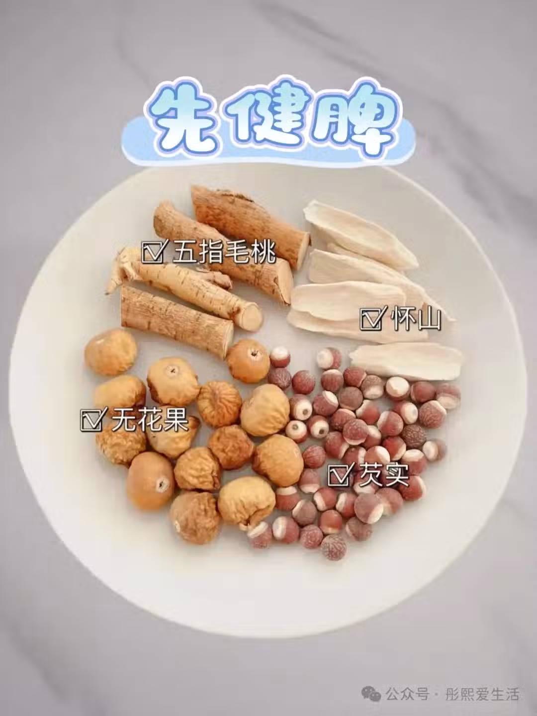 先健脾:五指毛桃、芡實、無花果、懷山
