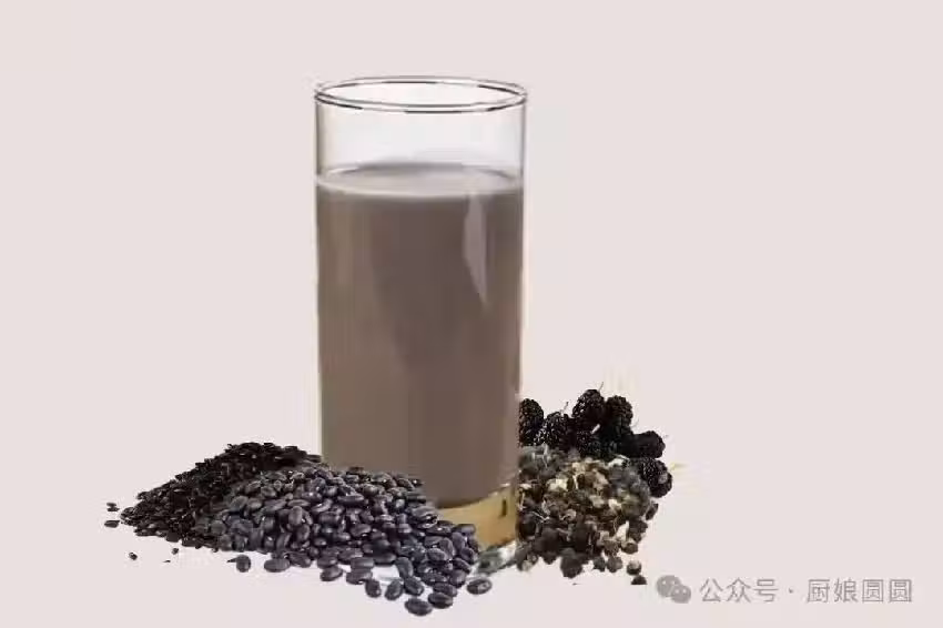 黑芝麻10克,黑豆15克,葵瓜子10克,巴旦木5克,打成粉沖泡或直接打成豆漿。