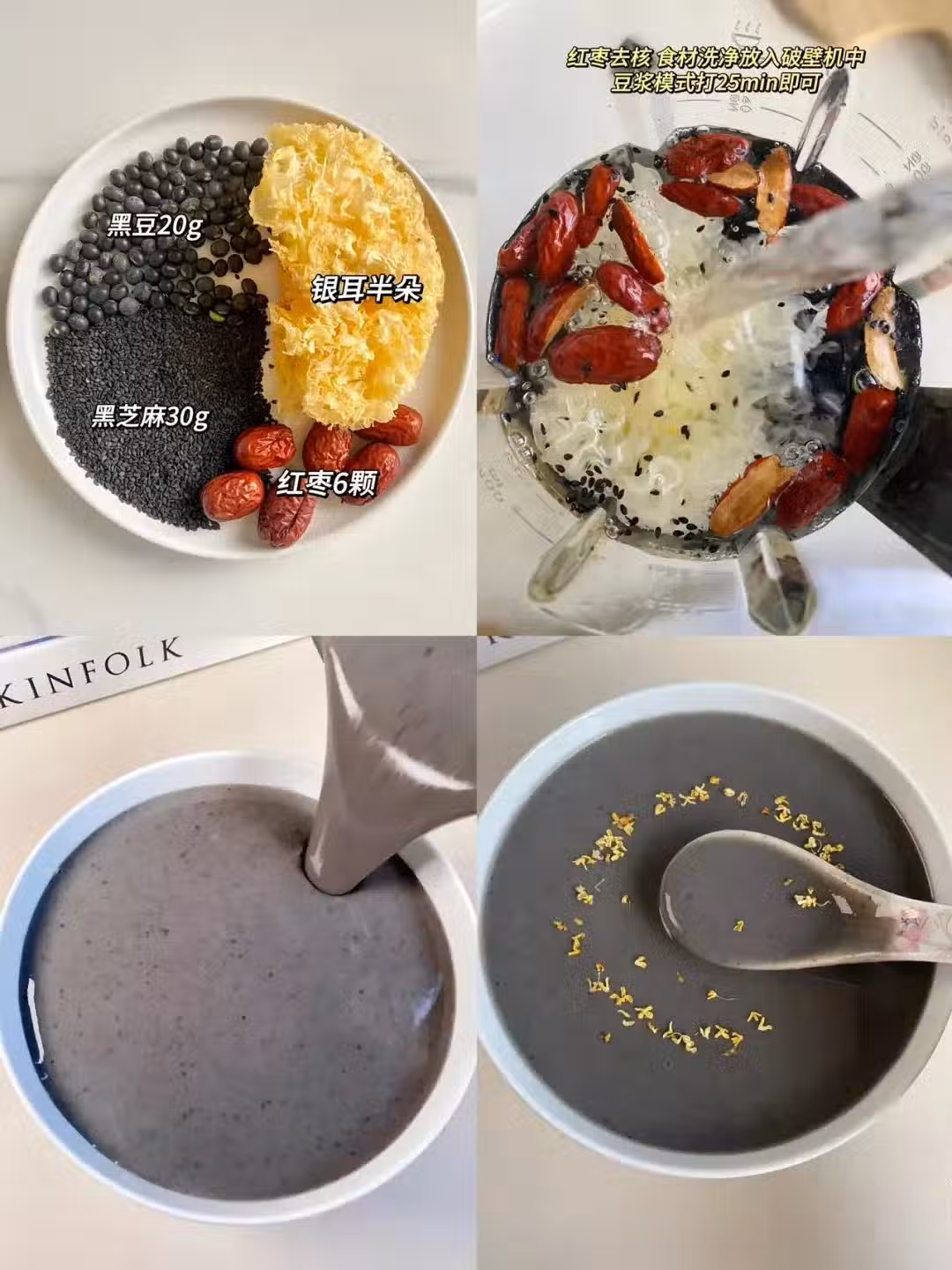 所有食材洗凈放入破壁機中,加入700ml清水,按豆漿模式打25分鐘即可~