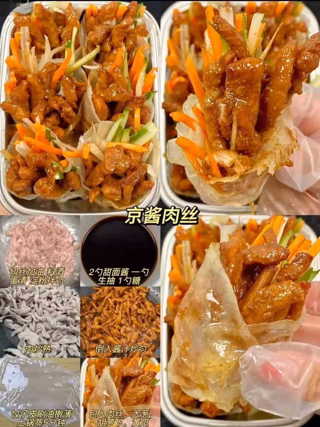 老北京賽博平替!餃子皮擀薄蒸熟,包黃瓜絲、炒好的甜麵醬肉絲,一口塞進嘴,醬香混著清爽,卷餅店老闆連夜找你買配方!