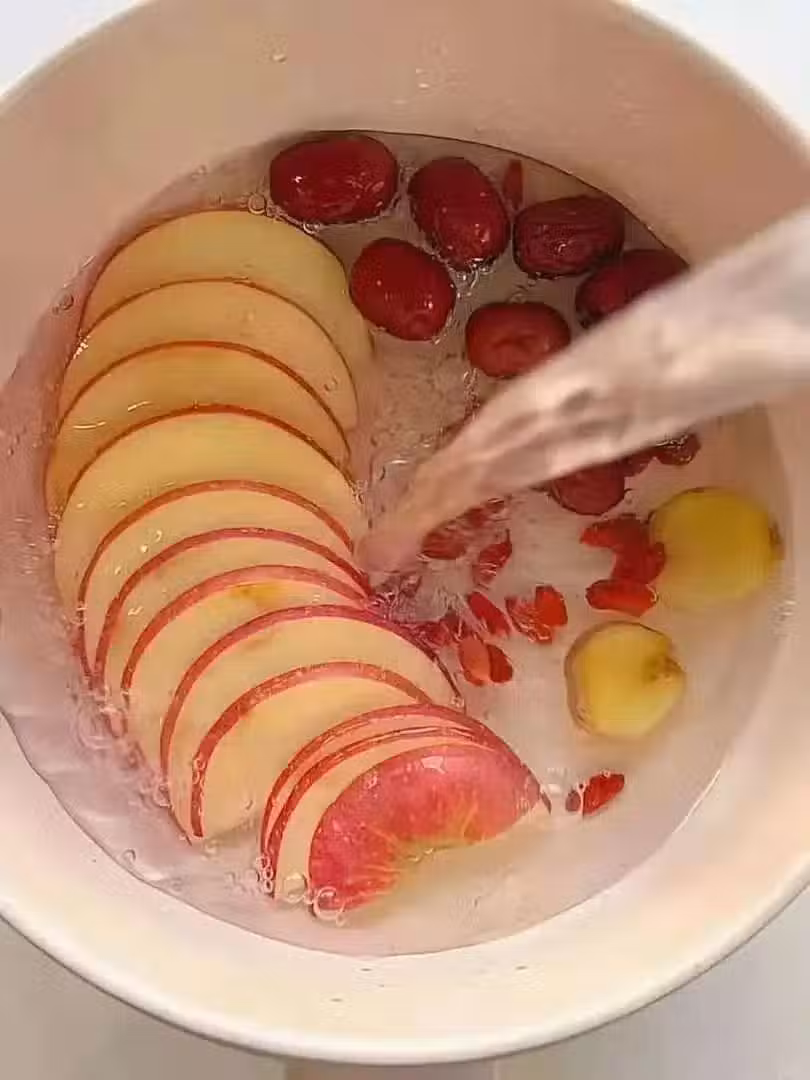 蘋果切片,薑片、紅棗、枸杞各3克。