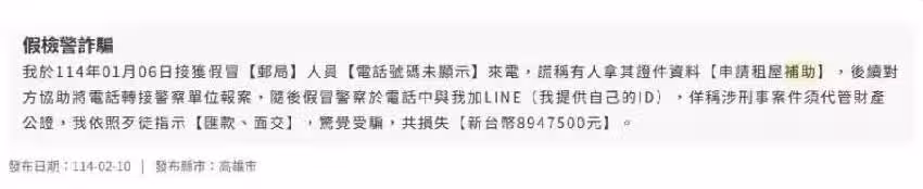 不料該警察單位也是詐騙集團假冒,透過電話要受害者加LINE,佯稱涉刑事案件須代管財產,受害人依照指示匯款、面交等,最終讓對方得手新台幣894萬7500元!