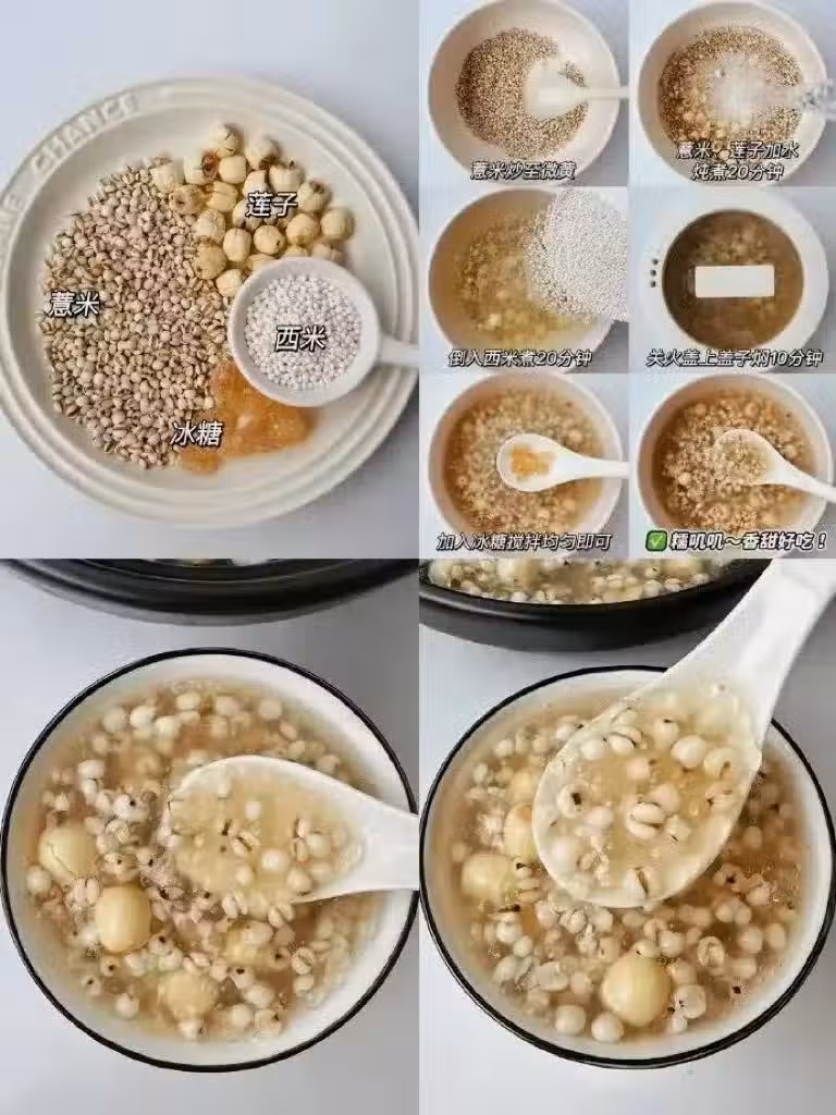 1. 薏米炒至微黃;薏米、蓮子加水燉煮20分鐘