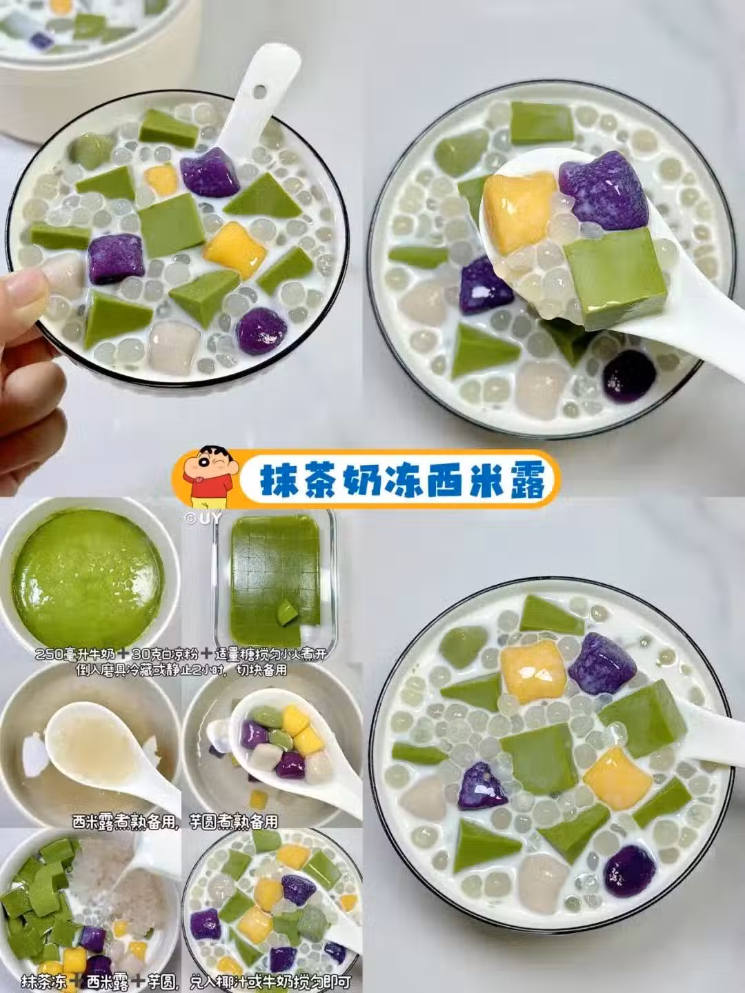 3️⃣抹茶塊➕椰奶/牛奶➕西米芋圓攪拌均勻即可。