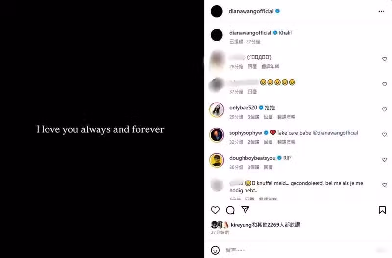 方大同經紀公司昨(1日)發文證實方大同離世,王詩安也在社群IG發文,先是親密貼上方大同的英文khalil,並以黑底白字的英文寫下「I love you always and forever。(我永遠愛你)」底下粉絲全哭翻難過留言「抱抱」、「不知道說什麼只是一直哭一直哭」、「我也沒想到他21號就走了 」、「他永遠是你最特別的人」、「不想相信」、「好難過」