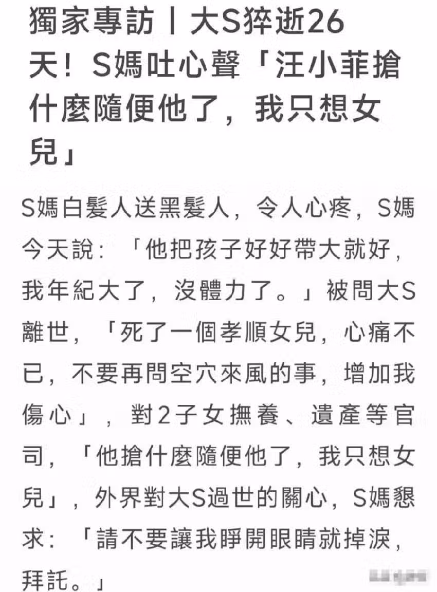 從大S媽媽黃春梅這幾天的動作來看,大S遺產的爭奪戰已經進入白熱化,S媽和具俊曄都在發力。