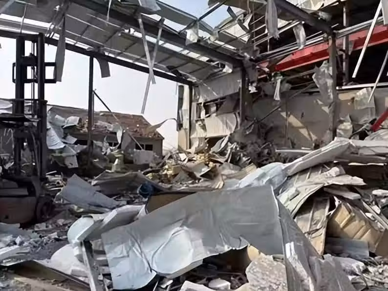 13時6分許,生產車間發生爆炸,彩鋼板外牆和屋頂被炸開,生產設備損毀。