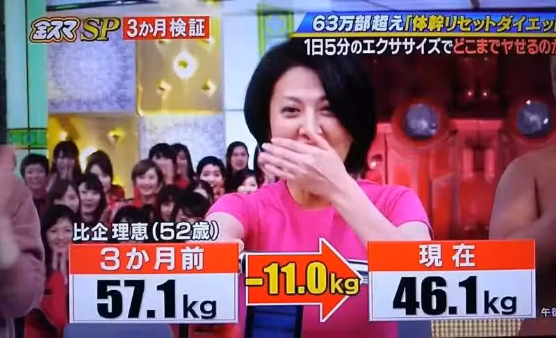 日本著名節目「中居大師說」更設立特別企劃實驗特集,邀來52歲女星與33歲歌手作實測,在3個月後兩人的體脂肪率都下降10%,女星減掉11kg,歌手更減掉17kg,就連腰圍也瘦了20cm!