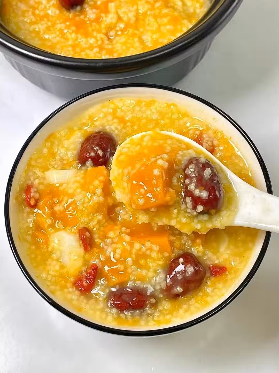 南瓜100g,山藥80g,小米40g,紅棗4-8顆,枸杞適量